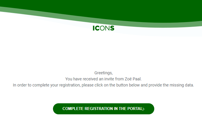 Go to the inbox of your email account and click on COMPLETE REGISTRATION ON ICONS. Follow the link to submit and confirm your account details.