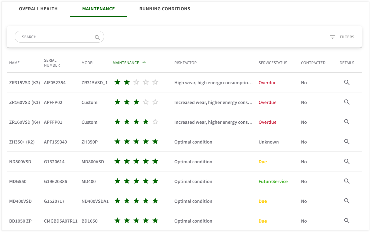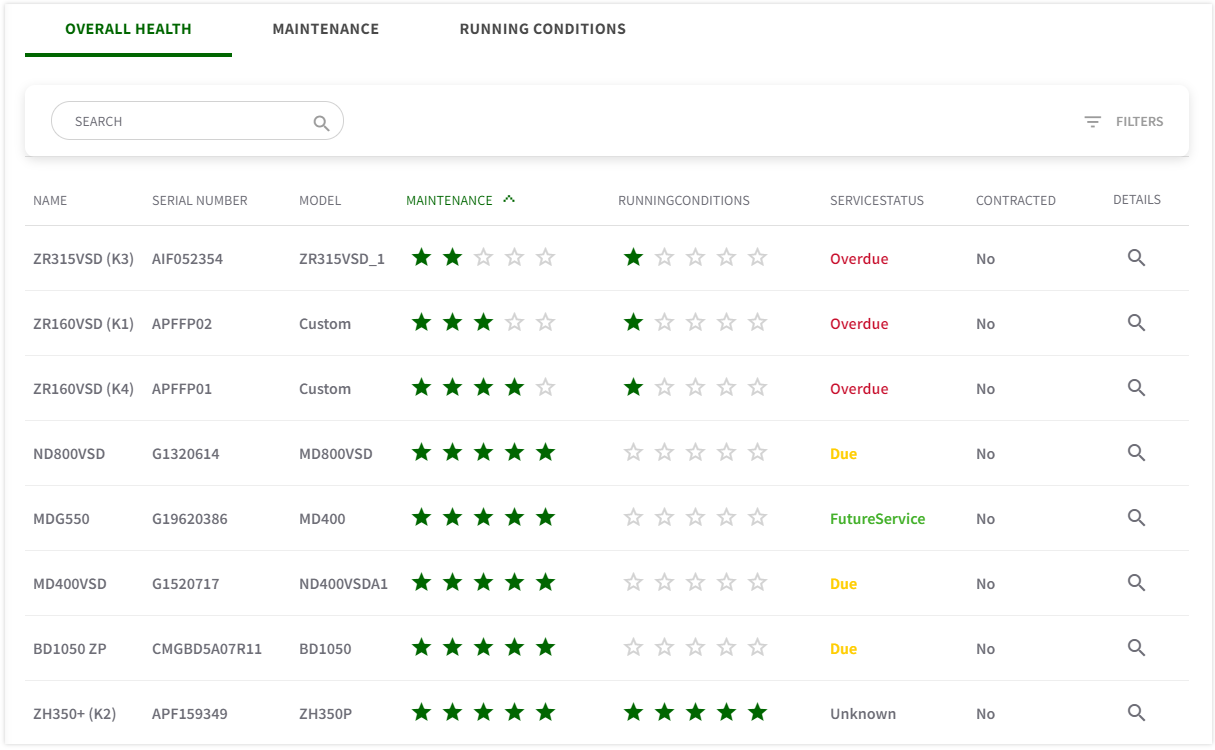 The Overall Health grid shows a list of machines present in the selected site. You can use the search and filter options to help you find specific data. Each row shows information about the machine, including the current service status and information about the contract. By clicking on the magnifier icon in the DETAILS-column, you open the overview of machine-specific health details. Learn more about this overview here.