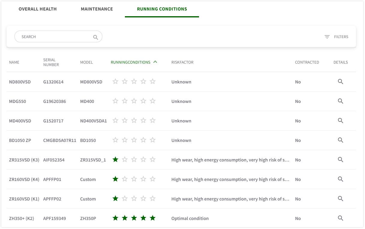 By pressing the RUNNING CONDITIONS tab, the data grid will show you detailed information about your machines' running conditions score. The score and risk factor levels are explained here.