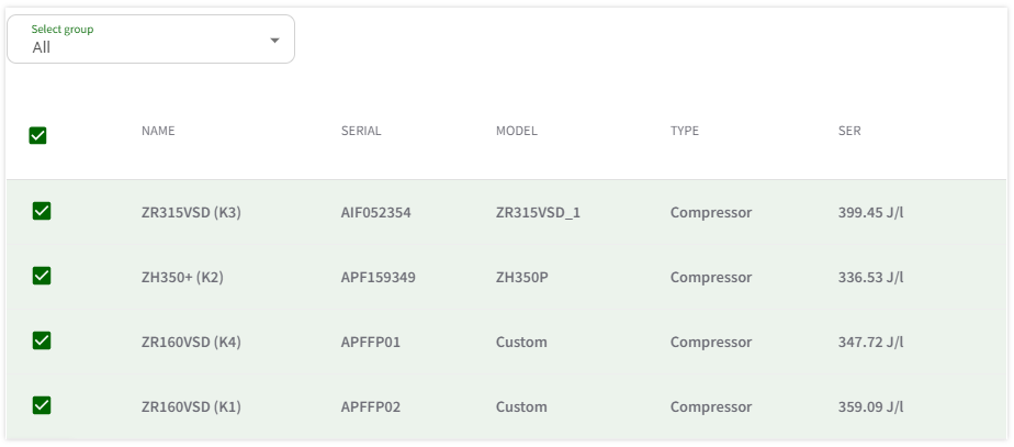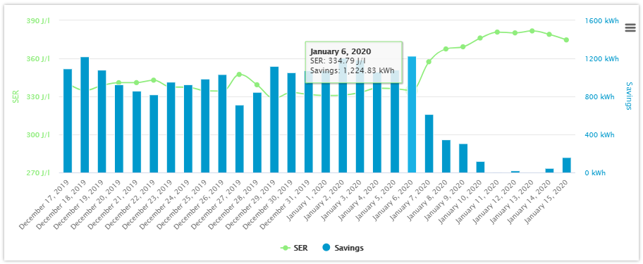 The table shows the energy saved and financial savings based on the selected reporting period (columns 2 and 3). Columns 4 and 5 show the energy saved and financial savings based on the selected date (start date cumulated savings).