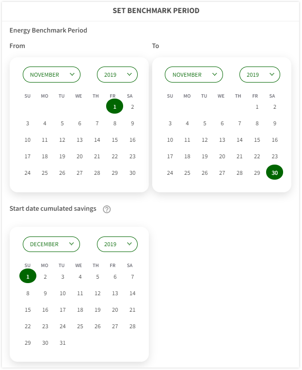 Another important setting is the START DATE ACCUMULATED SAVING. You need to select a reference date, for example, the date where you improved your energy efficiency. The savings of your installations shown in the overview are based on the energy score of this period.